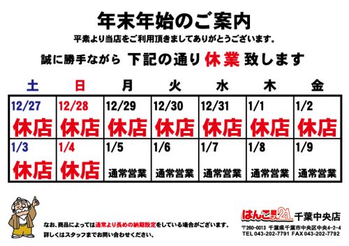 | ※年末年始、GW、夏季休業等は別途ご案内させていただきます。 ご不便をお掛け致しますが、今後とも何卒宜しくお願い申し上げます。 |